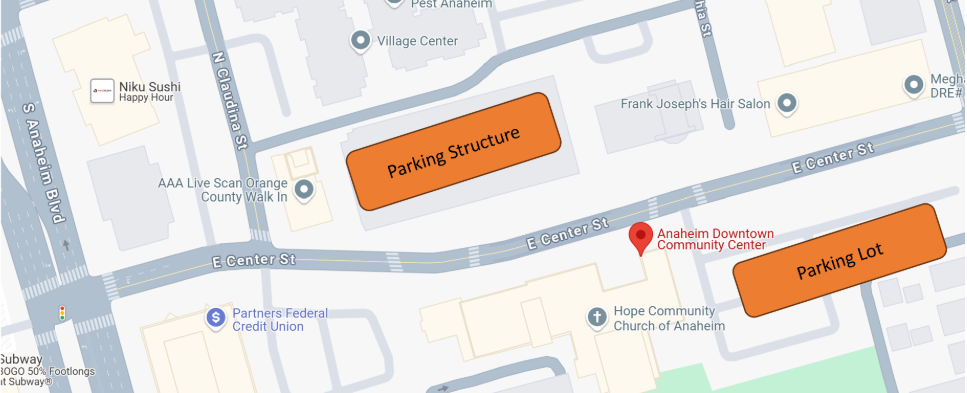 다운타운 애너하임 커뮤니티 센터는 주차할 수 있는 두 개의 구역이 있습니다.